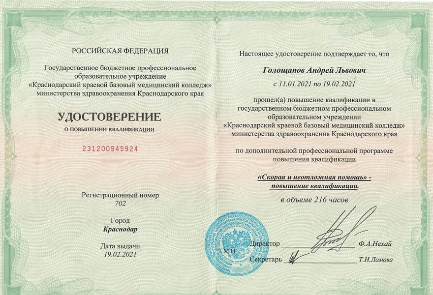 В 2018 году прошел курс повышения квалификации в Южно-Российском научно-исследовательском институте психиатрии и наркологии по теме «Современные подходы к лечению алкогольной и наркотической зависимости»;